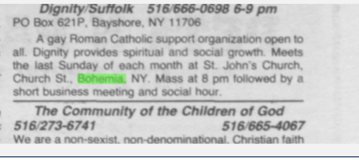 Bohemia’s LGBT history extends far beyond the Central, which is a reminder to us that the gay guides can’t tell us everything we need to know about queer past. For example, we know from gay and lesbian newspapers that by the 1980s (past the currently available data on Mapping the Gay Guides), the Suffolk branch of the gay Catholic group Dignity began meeting at the St. John’s Church in Bohemia, evidence of a queer religious community in the hamlet.