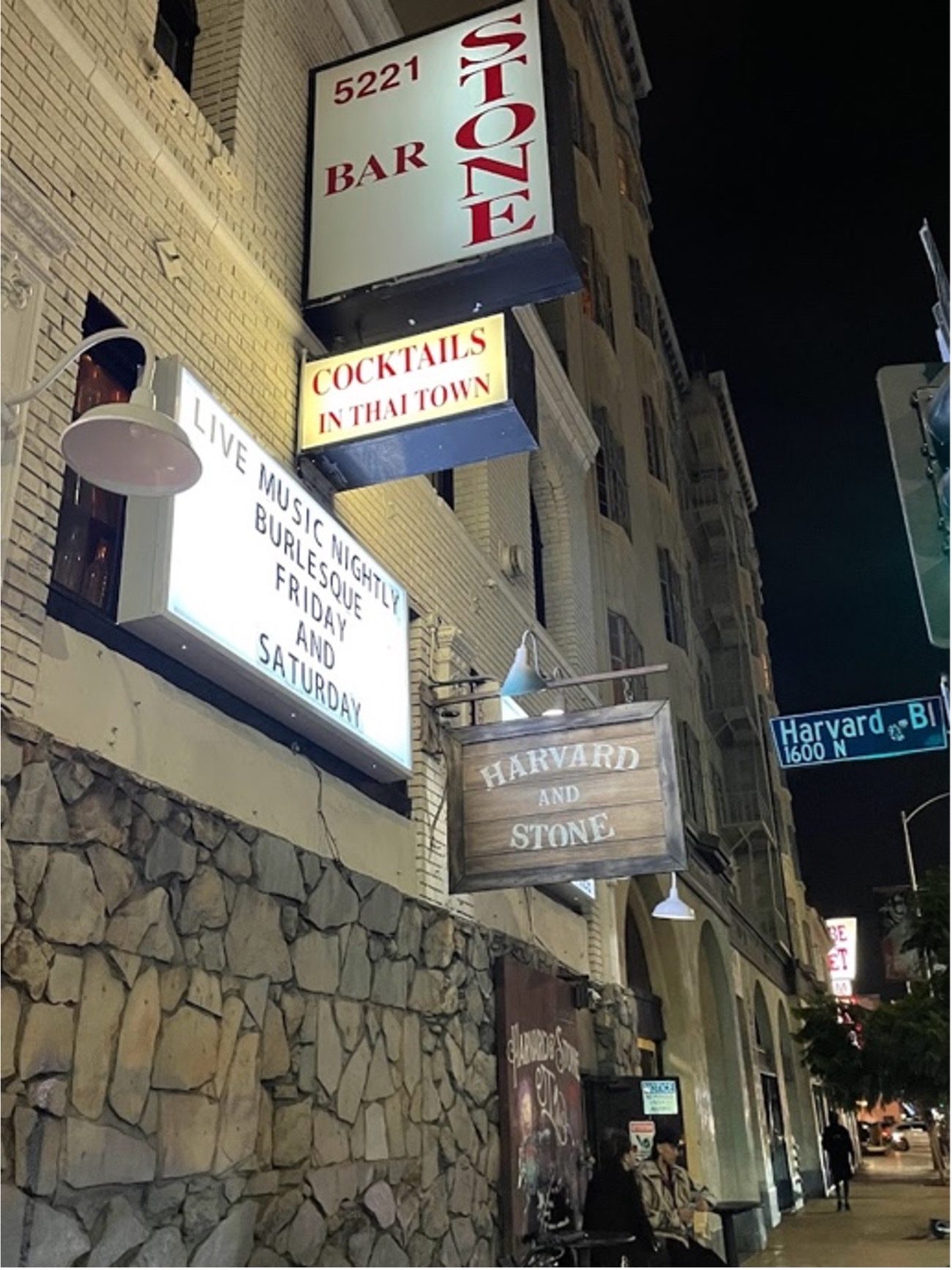 Between 2006 and 2009, there are no listings of the 5221 Hollywood Blvd. location in the Bob Damron guides. The Stone Bar briefly returned between 2010 and 2011 but the amenity feature of “(MRC-A)” has vanished. In 2011, the location received new owners and a new name, the Harvard & Stone Bar, which is currently open as of 2023. Seemingly aware of the location’s gay history, Harvard & Stone attempts to dissociate from it and even regulates their dress code which “highly” discourages “loud colors.”12 However, the history of Mugi’s lingers, symbolized by a sign with gay argot that hovers above Harvard & Stone, promising cocktails in Thai Town. In the ever-changing landscape of Los Angeles, the legacy of Mugi's serves as a poignant reminder of the city's diverse and complex LGBTQ+ history, and the enduring quest for safe spaces within the community.