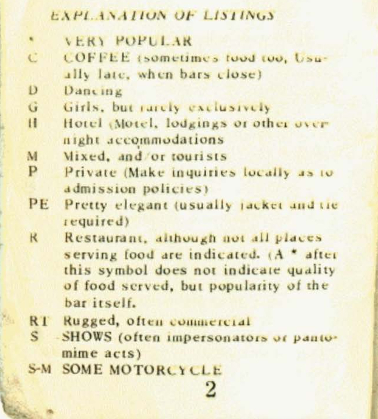 Figure 1. Explanation of Listings from 1965 Bob Damron Address Book. Note that no PT label is listed.