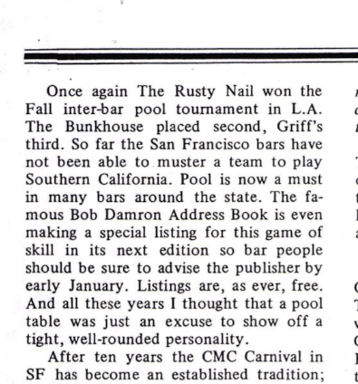 I got to wondering what led Damron to add this designation in the 1977 guide, and so I did some archival digging. Sure enough, I found a reference to Damron’s pool table designation in a 1975 issue of California Scene, a popular gay magazine in the 1970s. The article notes that the Rusty Nail won an inter-bar pool tournament in Los Angeles in 1975, evidence of a competitive culture of billiards in gay bars in the late 1970s. As California Scene (Figure 3) described the game, “pool is now a must in many bars around the state. The famous Bob Damron Address Book is even making a special listing for this game of skill in the next edition.” Bingo! Even more helpful to our Mapping the Gay Guide team, we get some direct evidence of how Damron collected his PT data—he simply asked bar patrons if the bars they went to had pool tables. “Bar people should be sure to advise [Damron] by early January.”